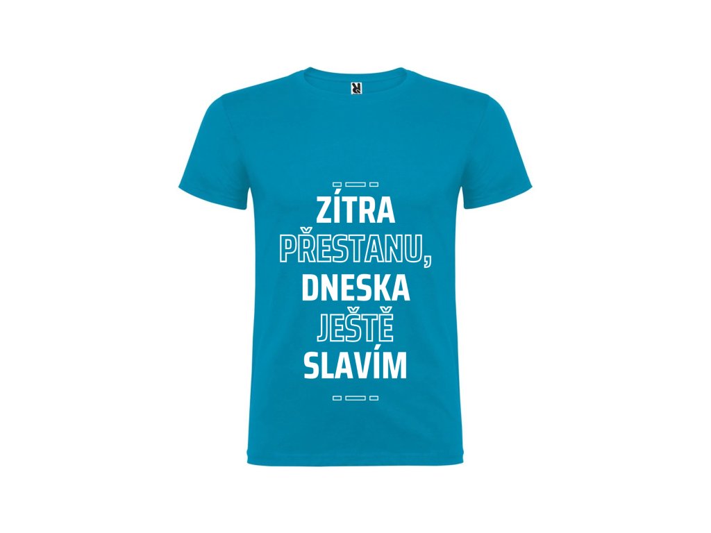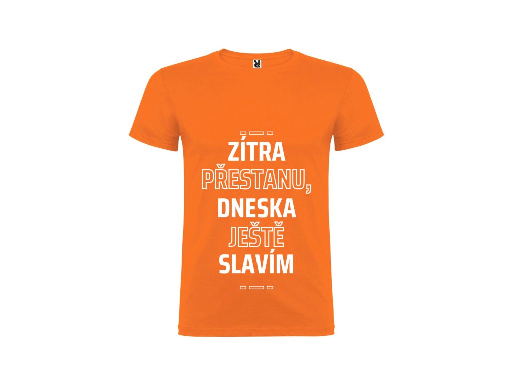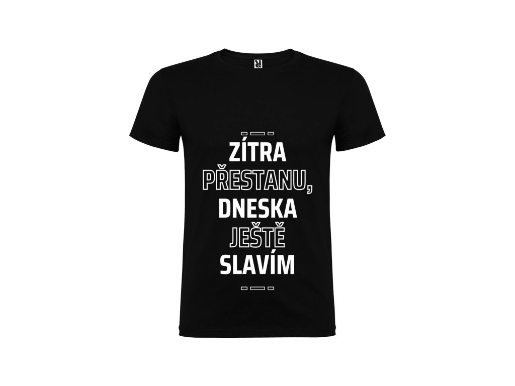 Všichni známe to legendární „zítra začnu“… ale dnes? Dnes se ještě slaví! Tričko s nápisem „Zítra přestanu, dneska ještě slavím“ je jako stvořené pro ty, kteří si umí užít každou chvíli naplno a odkládají odpovědnost na později – nejlépe na nikdy. Perfektní na večírky, narozeniny, rozlučky i úplně obyčejné dny, které si zaslouží trochu víc radosti (a možná i panáka).